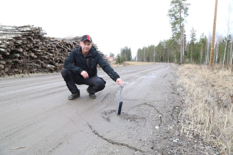 – Tämä vaatisi ihan kunnon kunnostuksen, eli koko tien uudelleen muotoilun ja esimerkiksi reunojen puhdistuksen. Nyt vesi jää seisomaan tielle. Nythän tämä ehkä kerran vuoteen höylätään traktorilla, mutta se on vähän sama kuin pissisi housuun. Helpottaa siis vain hetkisen.